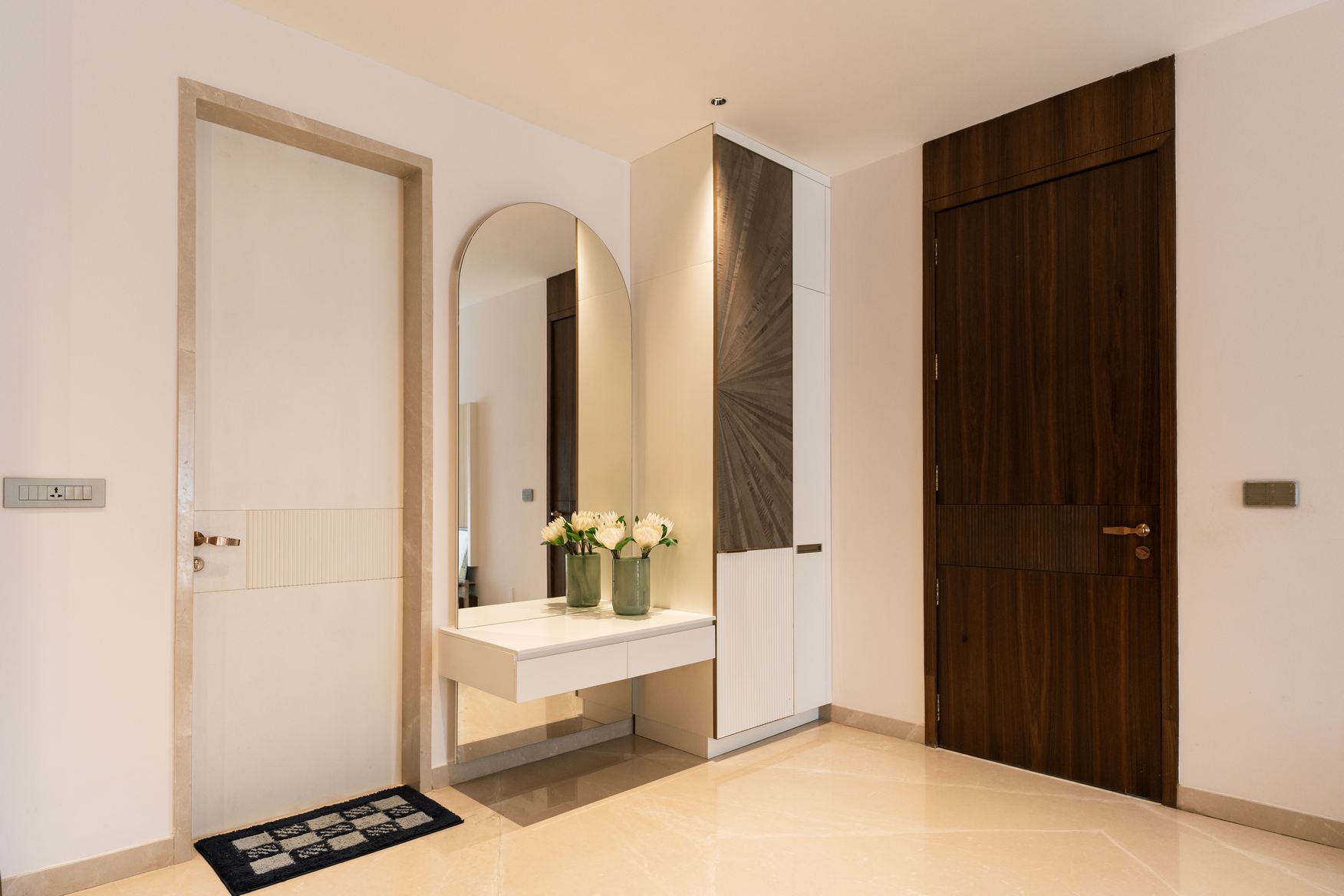 When Ramesh garu approached Elemmentz with a clear vision for his 3BHK apartment in Vajra Jasmine County, Hyderabad, he wanted a space that felt elegant, spacious, and highly practical. Our team translated this vision into a home that not only looks beautiful but lives beautifully too — with seamless design transitions and personalized features throughout.